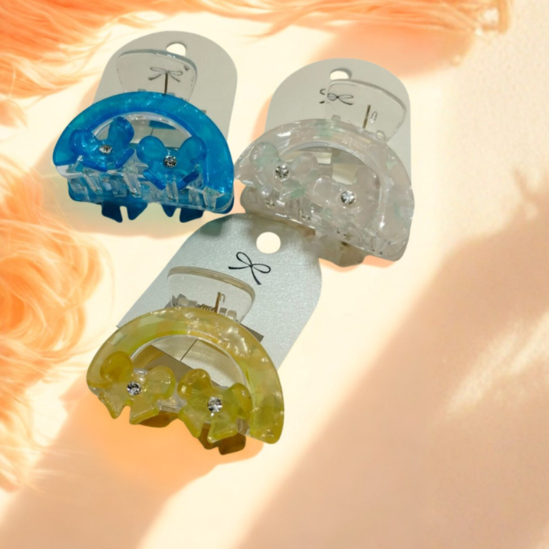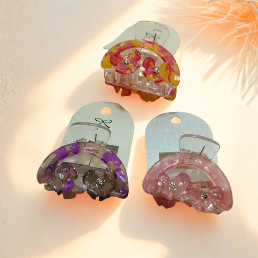 mini floral resin hair claw clips. Each clip features a translucent pastel base with delicate flower accents and subtle rhinestone sparkle, creating a dreamy, lightweight accessory that’s both cute and functional.